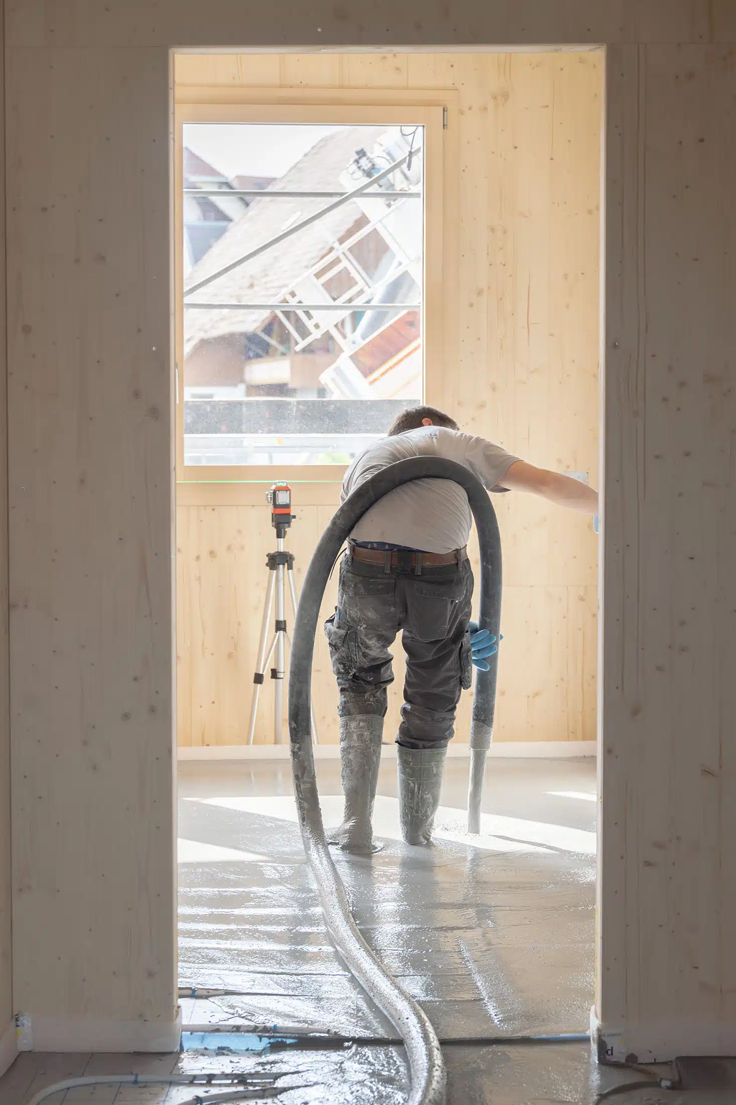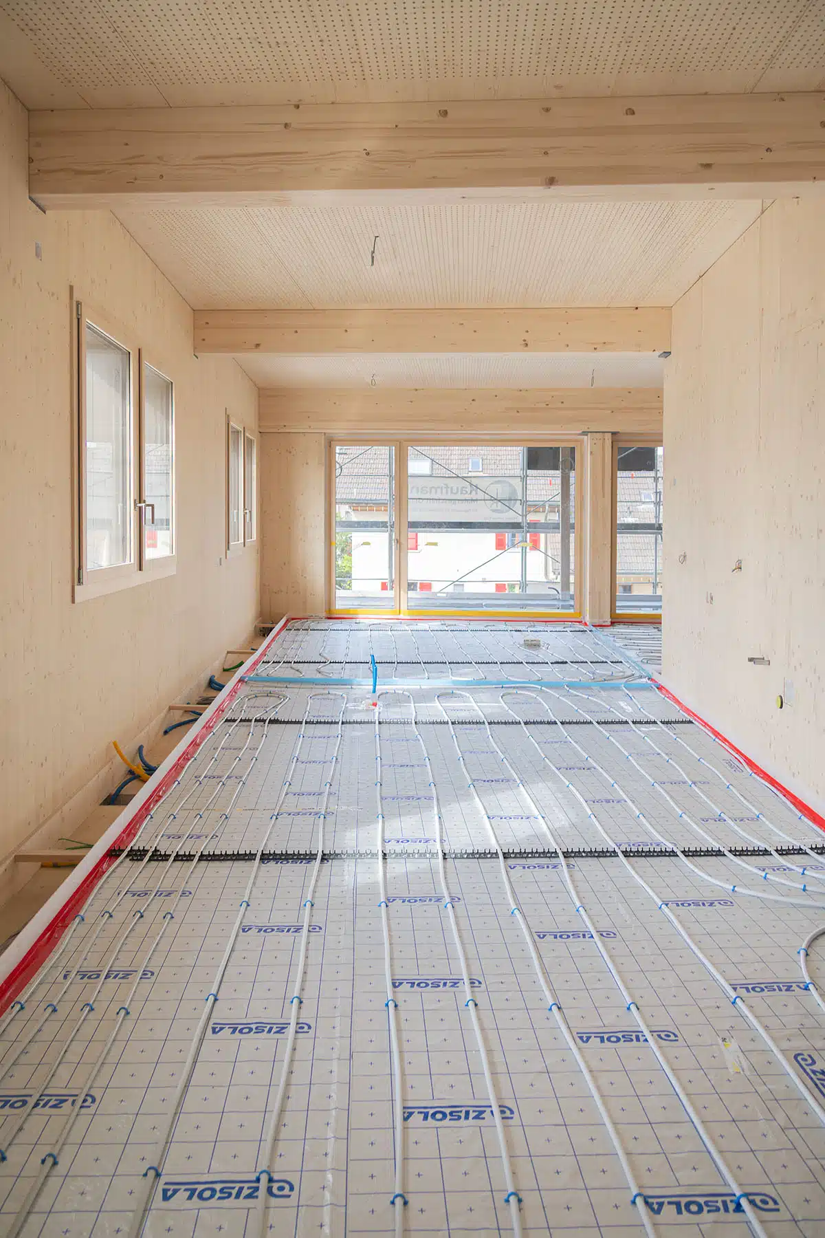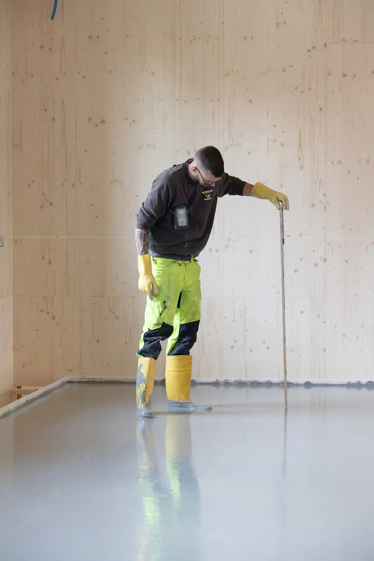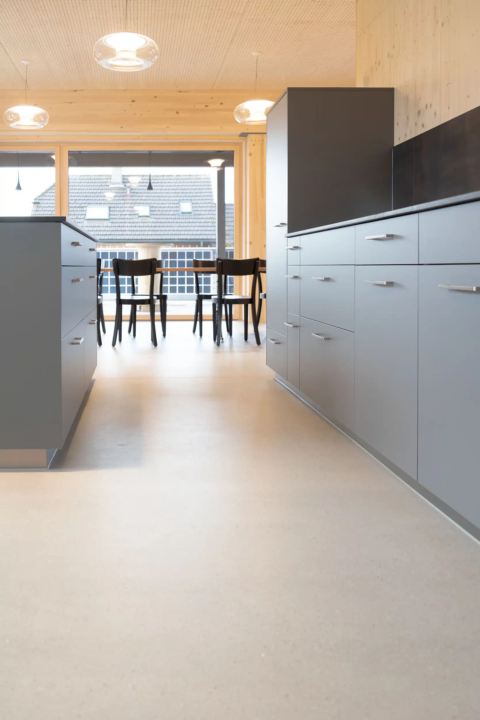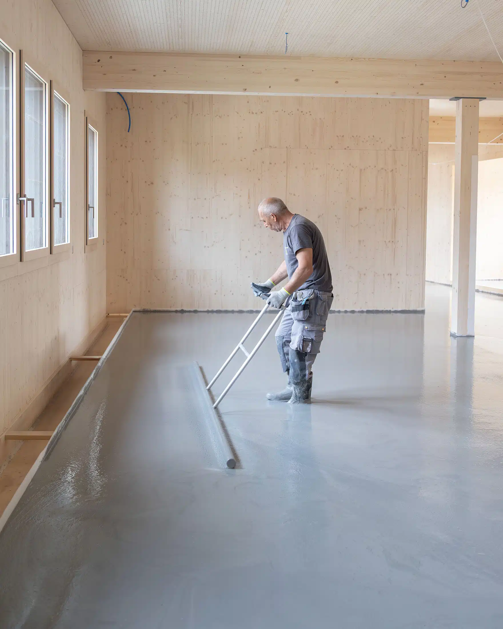Die Umsetzung durch Prima-Sol erforderte millimetergenaue Präzision insbesondere durch die sichtbaren Holzwände, die weder verschmutzt noch beschädigt werden durften. Insgesamt wurden 59 Tonnen Estrich verarbeitet, mit einem Ergebnis, das sowohl technisch als auch optisch höchsten Ansprüchen gerecht wird. Jeder Schritt zeugt von Erfahrung, Feingefühl und Fachkompetenz.