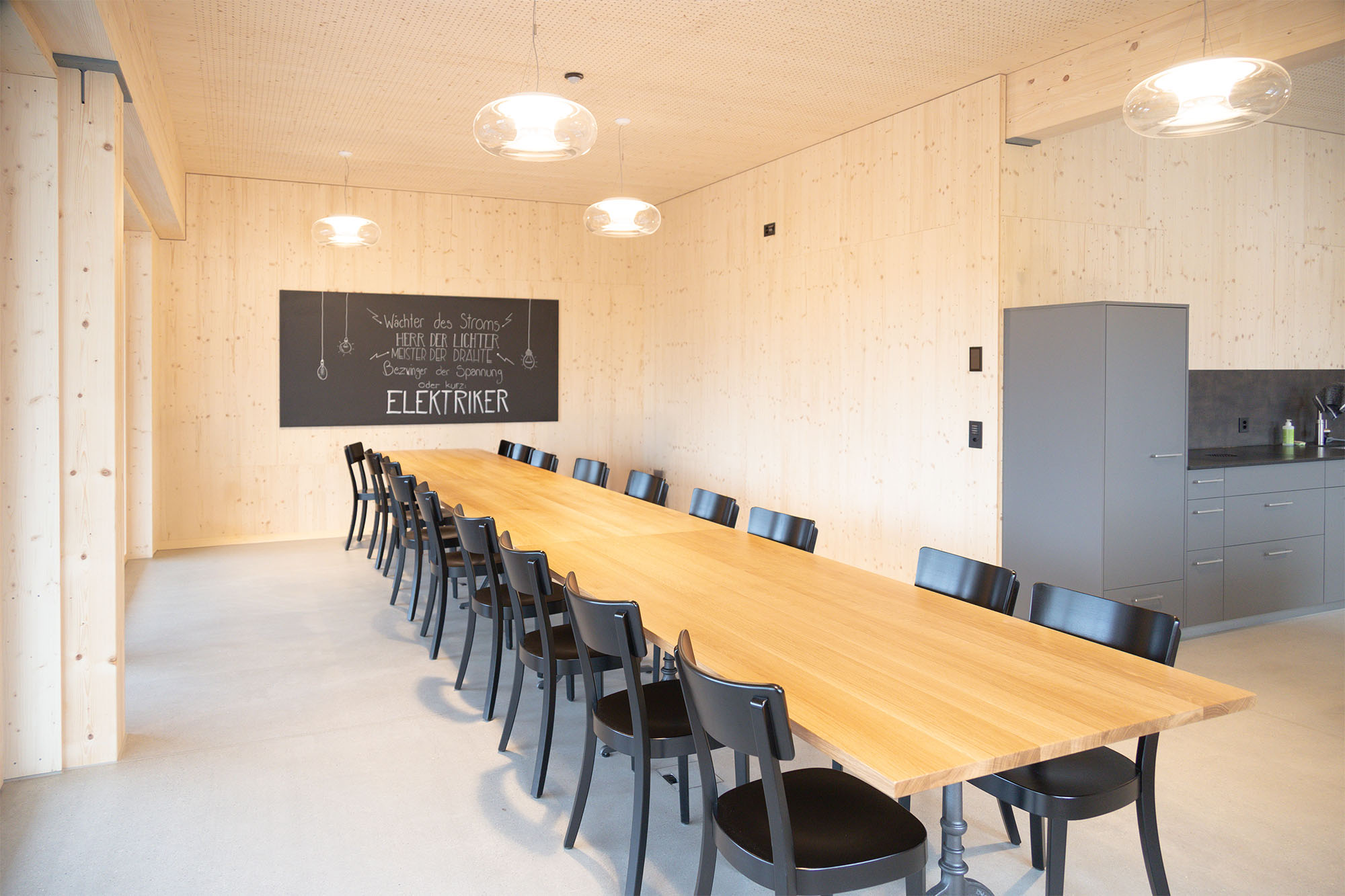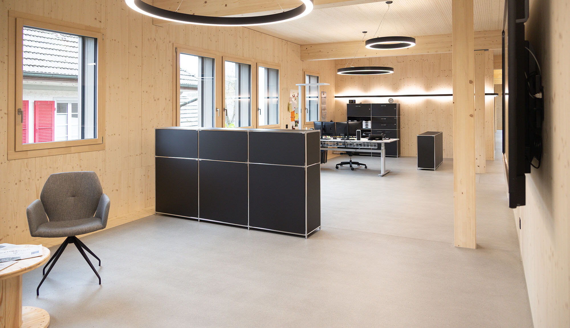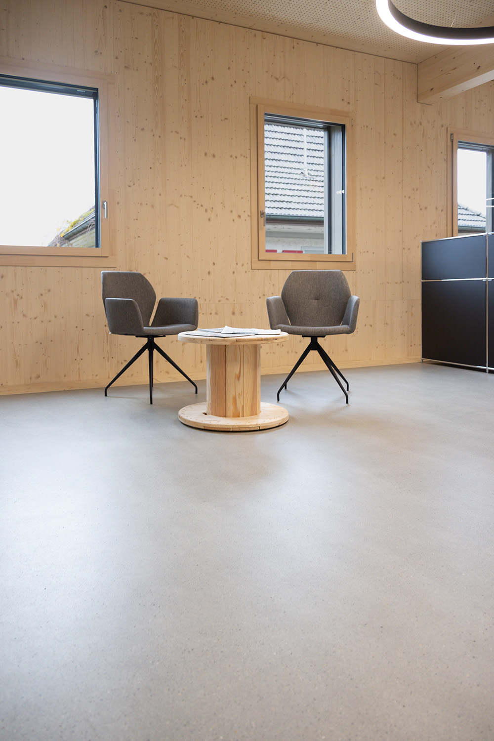 Das Projekt bei Elektro Roth Kerzers ist erfolgreich abgeschlossen – vom Einbringen bis zum letzten Schliff. Der neue Sicht-Anhydrit-Boden überzeugt in Festigkeit und Optik und fügt sich mit den sichtbaren Holzwänden zu einem stimmigen, funktionalen Workplace zusammen.
