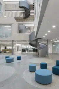 Many architectural highlights were created throughout this new construction project: as well as the spacious timber-clad atrium and terraced meeting points, these include striking spiral staircases. They blend marvellously into the overall appearance of the impressive atrium, thanks in part to the synthetic resin coating we applied to the steps – stained in matching colour shades.
