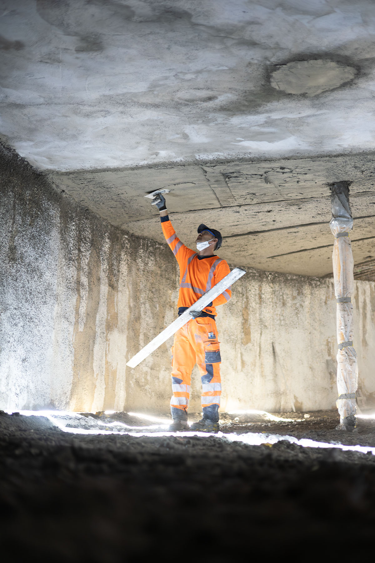 Nella prima fase, vengono rimosse le sezioni di calcestruzzo allentate e danneggiate fino a creare un substrato portante. Si applica quindi la malta di riprofilatura R4 ad alta resistenza. Essa garantisce la stabilità, livella le irregolarità e ripristina la statica originale. Il pavimento viene così preparato in modo tecnicamente pulito.